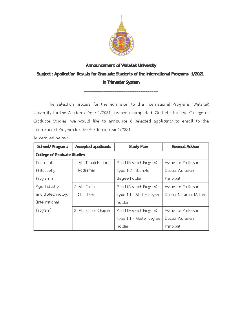 The selection process for the admission to the International Programs, Walailak University for the Academic Year 1/2021 has been completed. On behalf of the College of Graduate Studies, we would like to announce 8 selected applicants to enroll to the International Program for the Academic Year 1/2021. As detailed below: