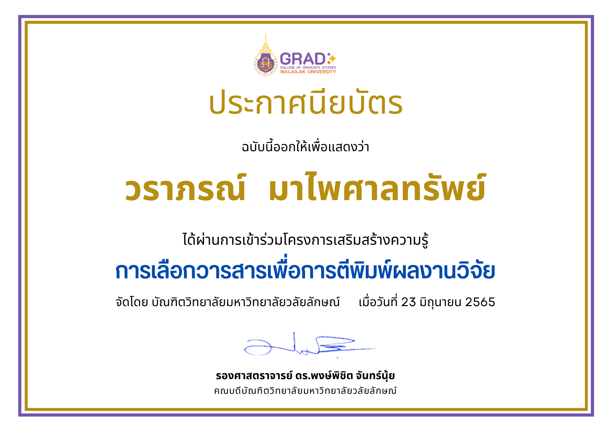| 76 | CRJ-E-certificate-76 | ผศ.ดร.พลอยชนก ปทุมานนท์ | คณะการแพทย์แผนไทยอภัยภูเบศร ม.บูรพา |
