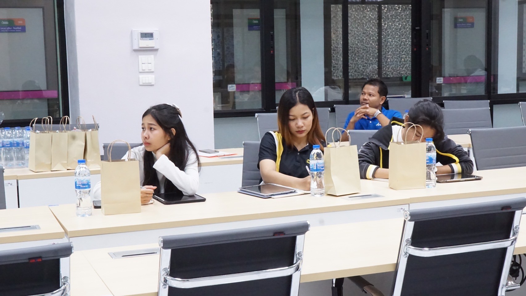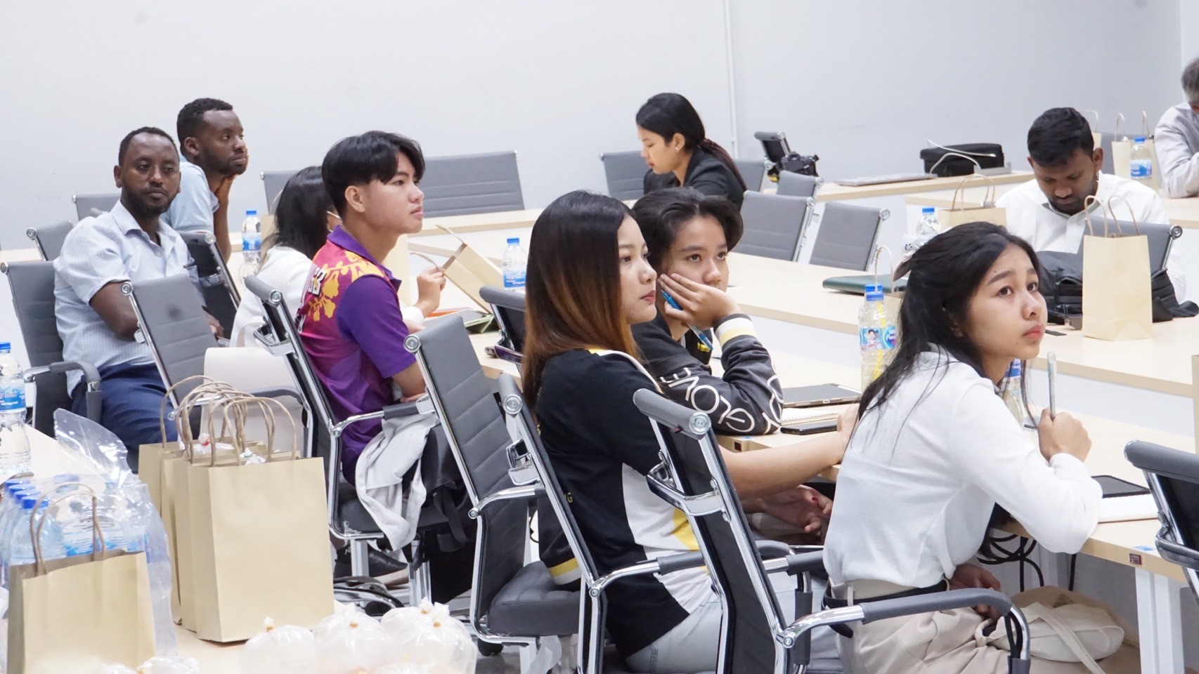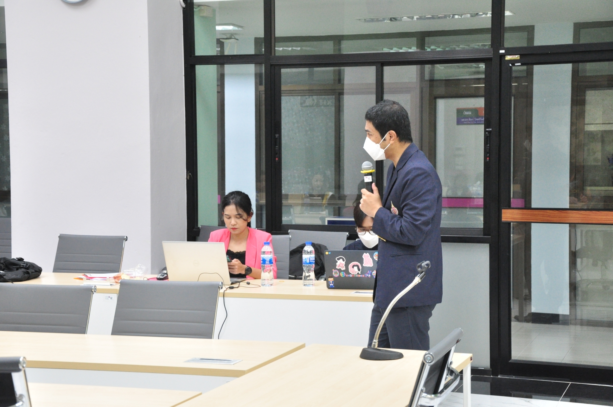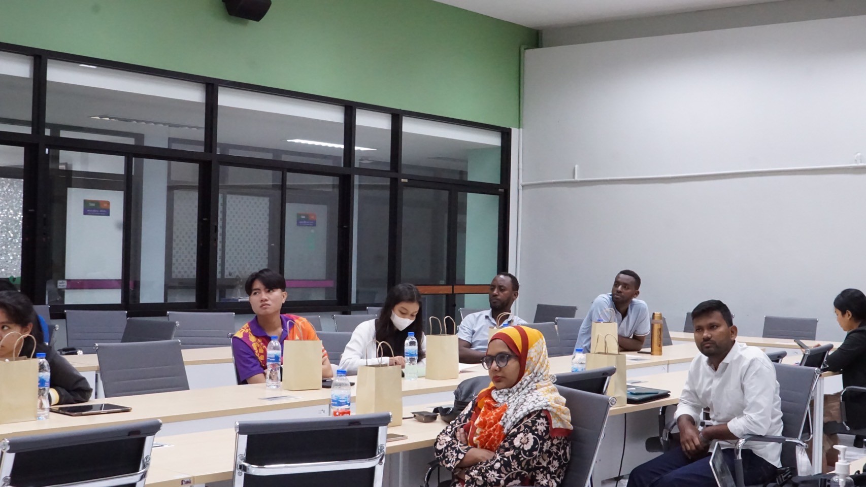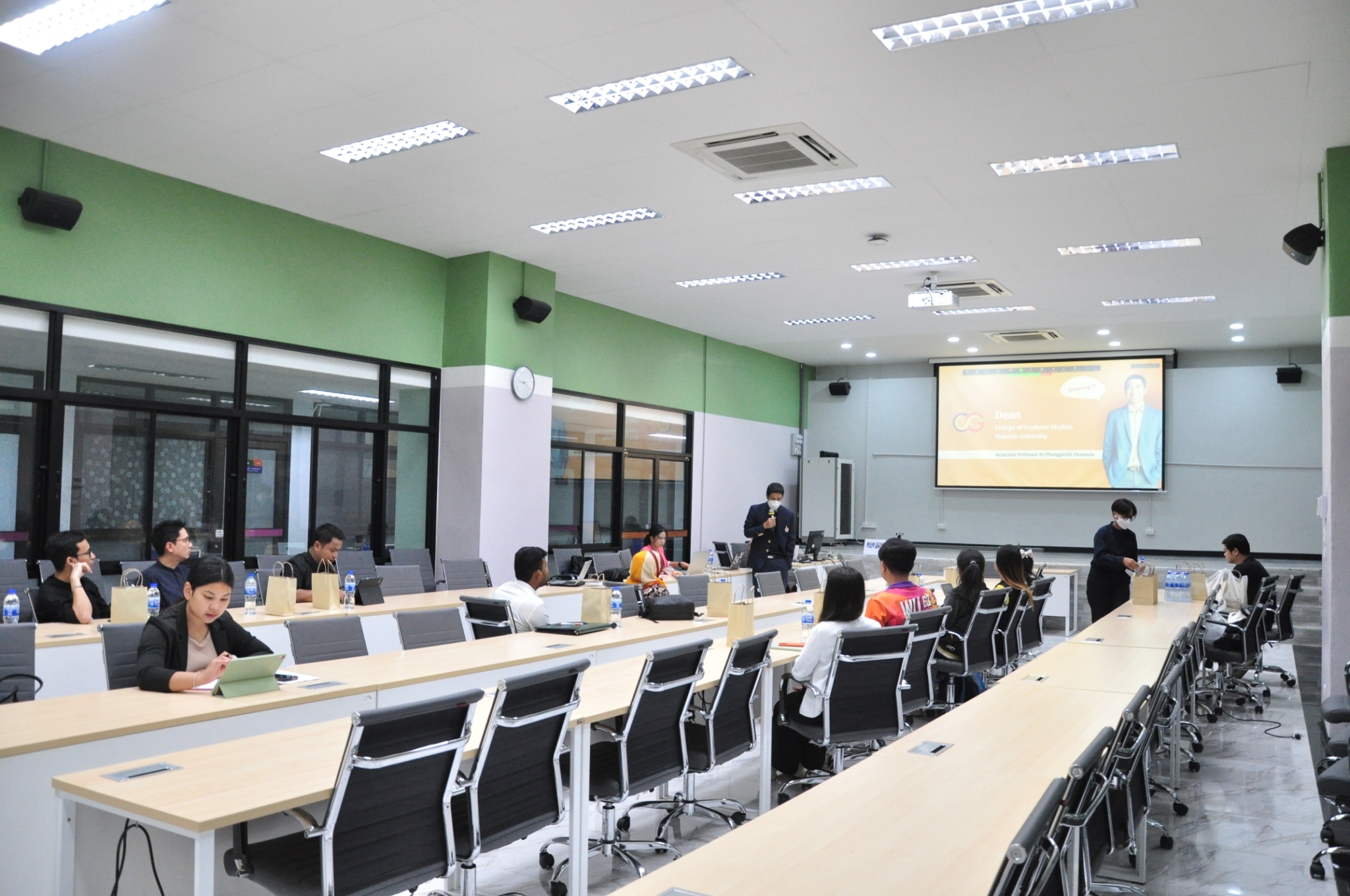 Key support units also participated in the orientation to provide essential information to the students. The Center for Educational Services (CES) introduced the registration system, represented by Miss Thanyalak Pansimai (CES Officer) and translated to English by Miss Supansa Kaewjaijong (CGS Academic Staff). Miss Aparn Chaisuwan and Miss Kittiporn Sriphet from the Center for Library Resources and Educational Media (CLM) presented library resources, databases, and how to access additional resources. Mr. Wisit Reungprom from the Center for Digital Technology (CDT) introduced digital services such as network services and email.