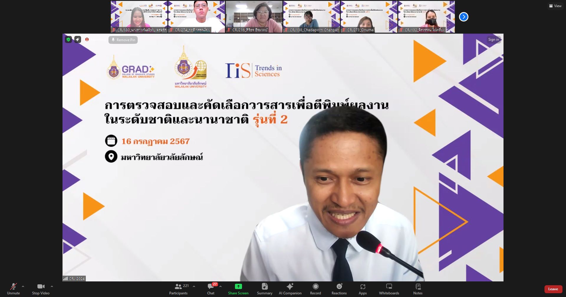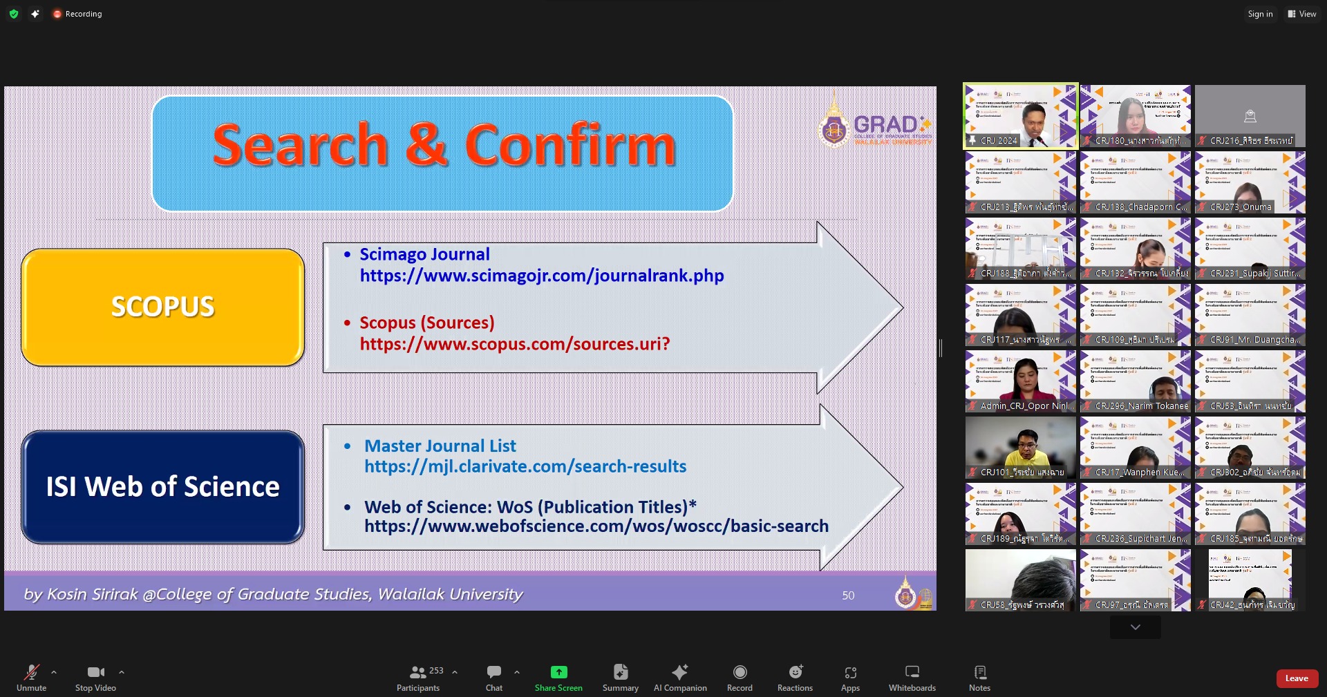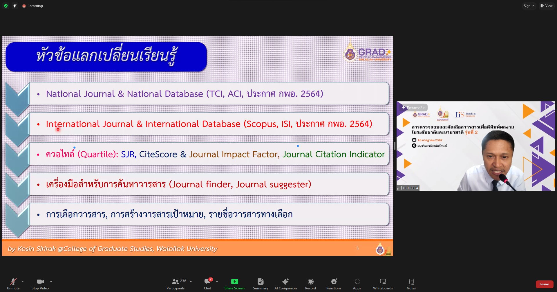 On July 16, 2024, the College of Graduate Studies (CGS), Walailak University (WU) managed the training entitled “Choosing the Right Journals for Publications (Journal & Database) 2024” presented by Mr. Kosin Sirirak, the Managing Editor of Trends in Sciences (TiS), at AD3411, the 3rd floor, Architecture and Design Building, Walailak University, simultaneously with the online platform via Zoom Cloud Application. There were more than 250 participants in this training.