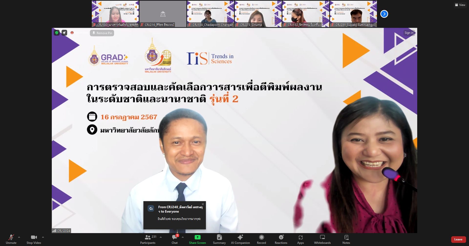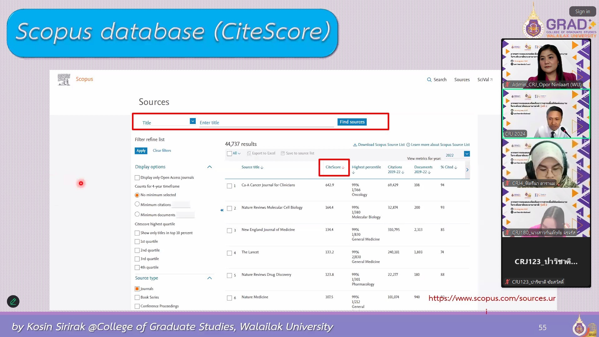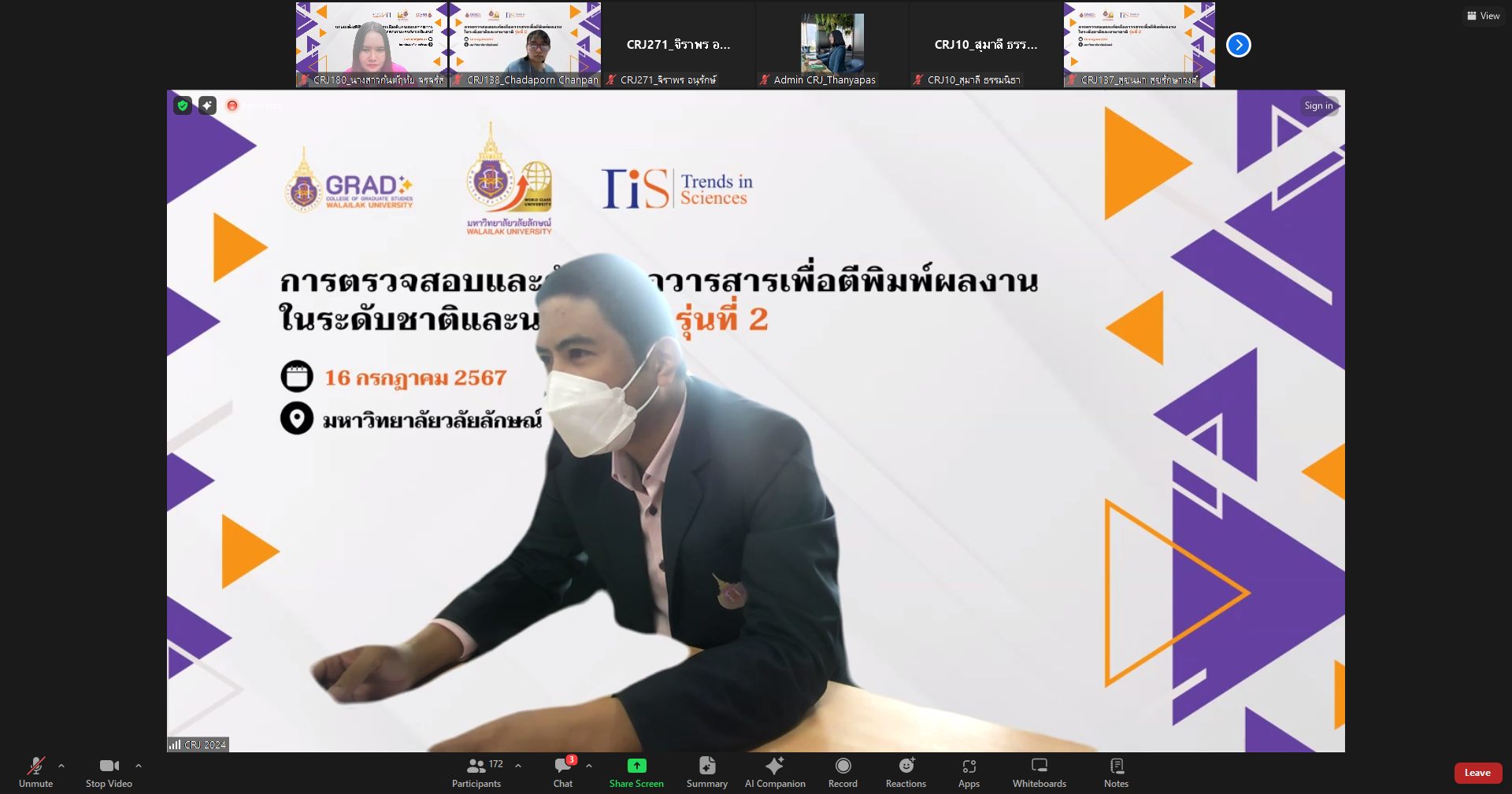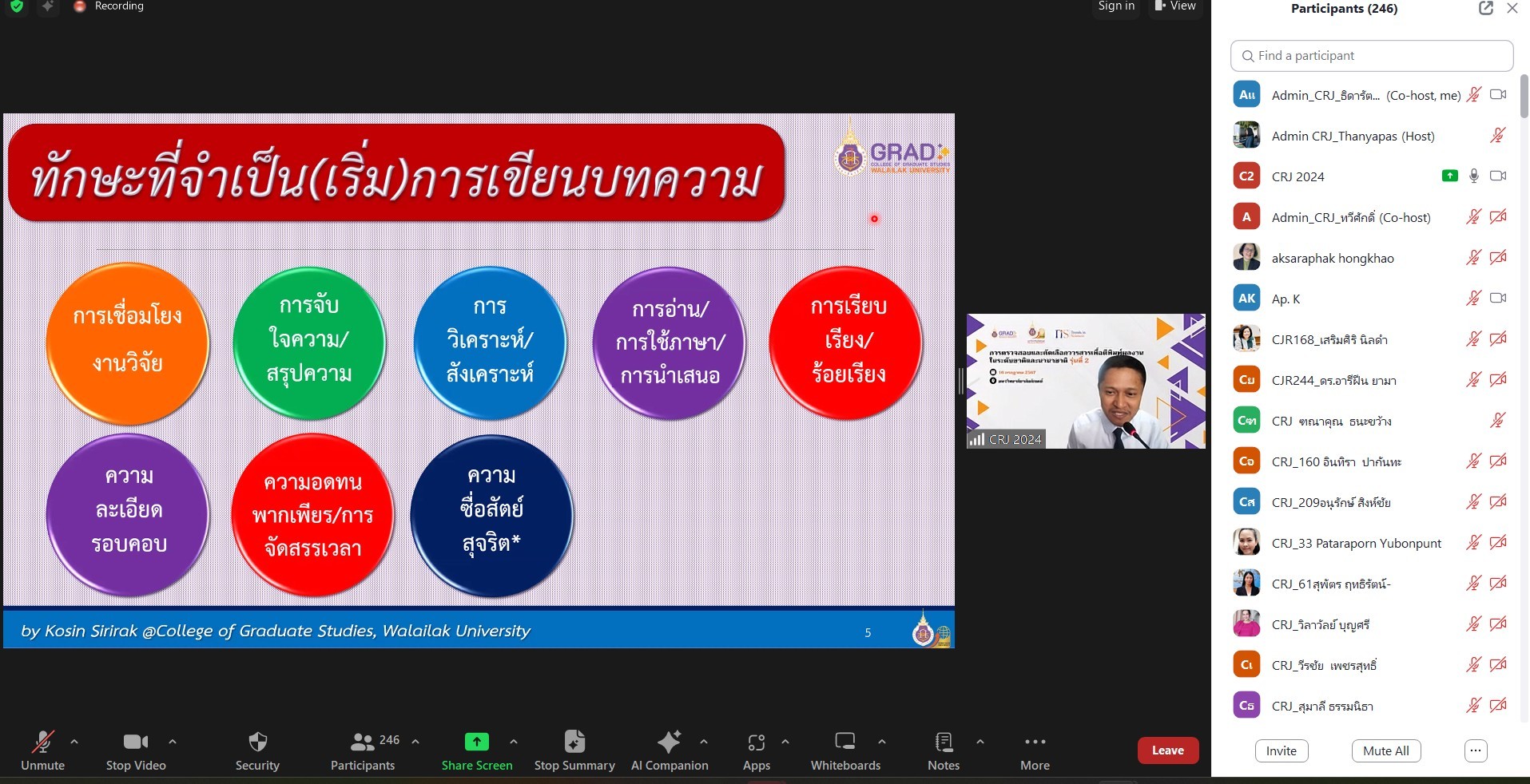 On July 16, 2024, the College of Graduate Studies (CGS), Walailak University (WU) managed the training entitled “Choosing the Right Journals for Publications (Journal & Database) 2024” presented by Mr. Kosin Sirirak, the Managing Editor of Trends in Sciences (TiS), at AD3411, the 3rd floor, Architecture and Design Building, Walailak University, simultaneously with the online platform via Zoom Cloud Application. There were more than 250 participants in this training.