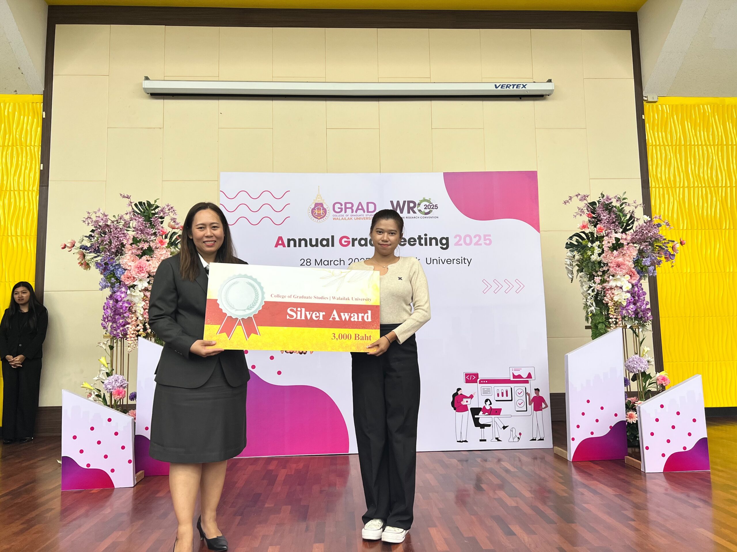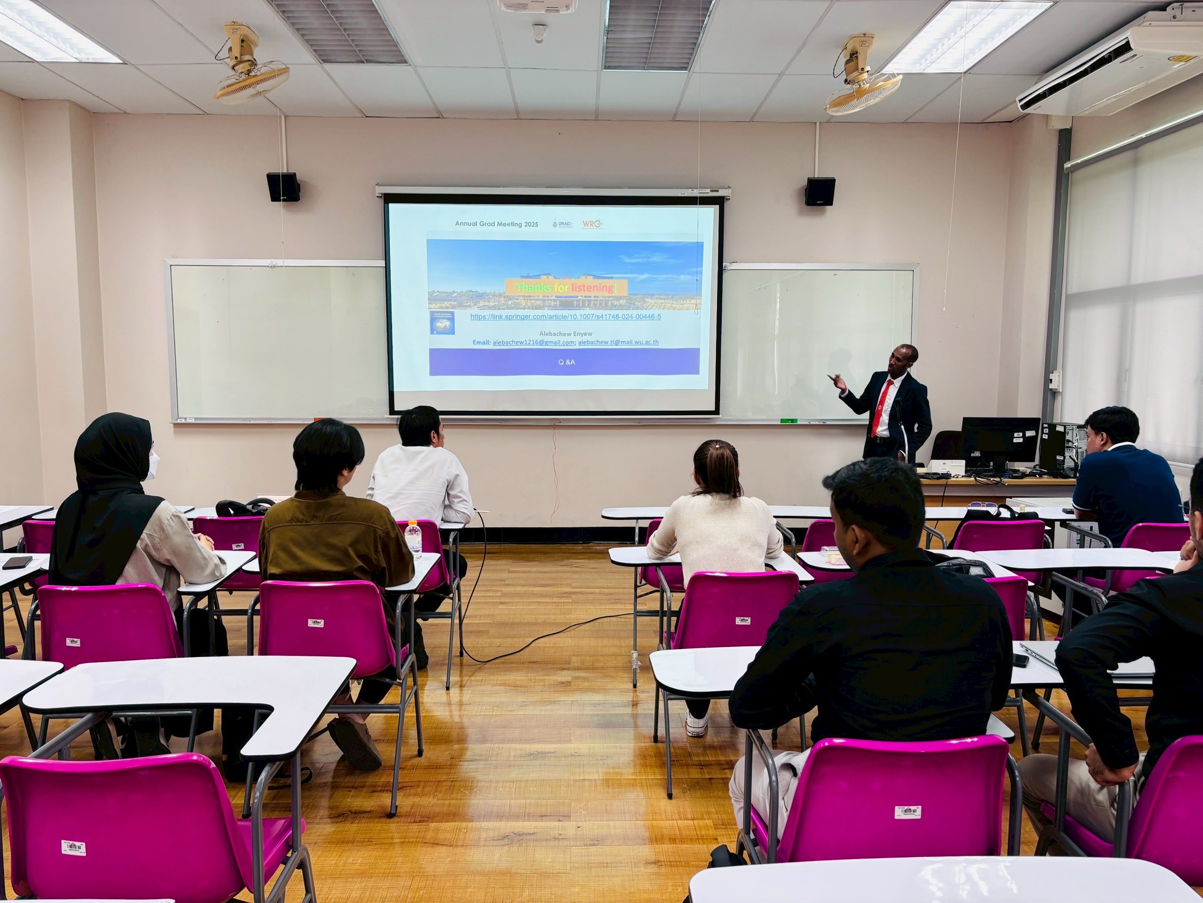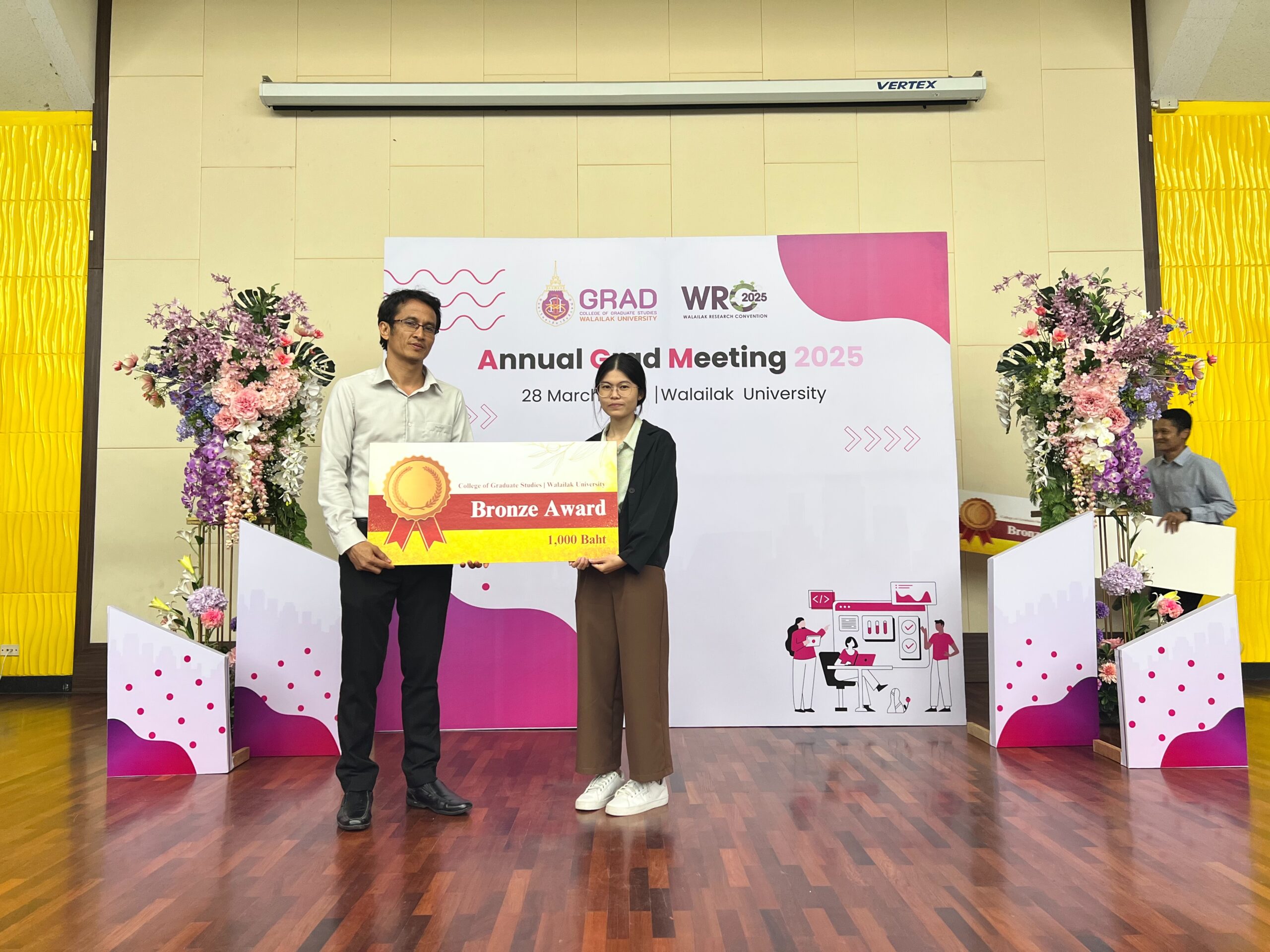 On March 28, 2025, College of Graduate Studies, Walailak University successfully organized the Annual Grad Meeting 2025 (AGM 2025) at Lecture Building 5, Walailak University, Thailand. This meeting provides a platform for graduate students to present their research and creative works. The event was presided over by Assoc. Prof. Dr. Phongpichit Channuie, Dean of the College of Graduate Studies, who emphasized the importance of research in driving societal progress.