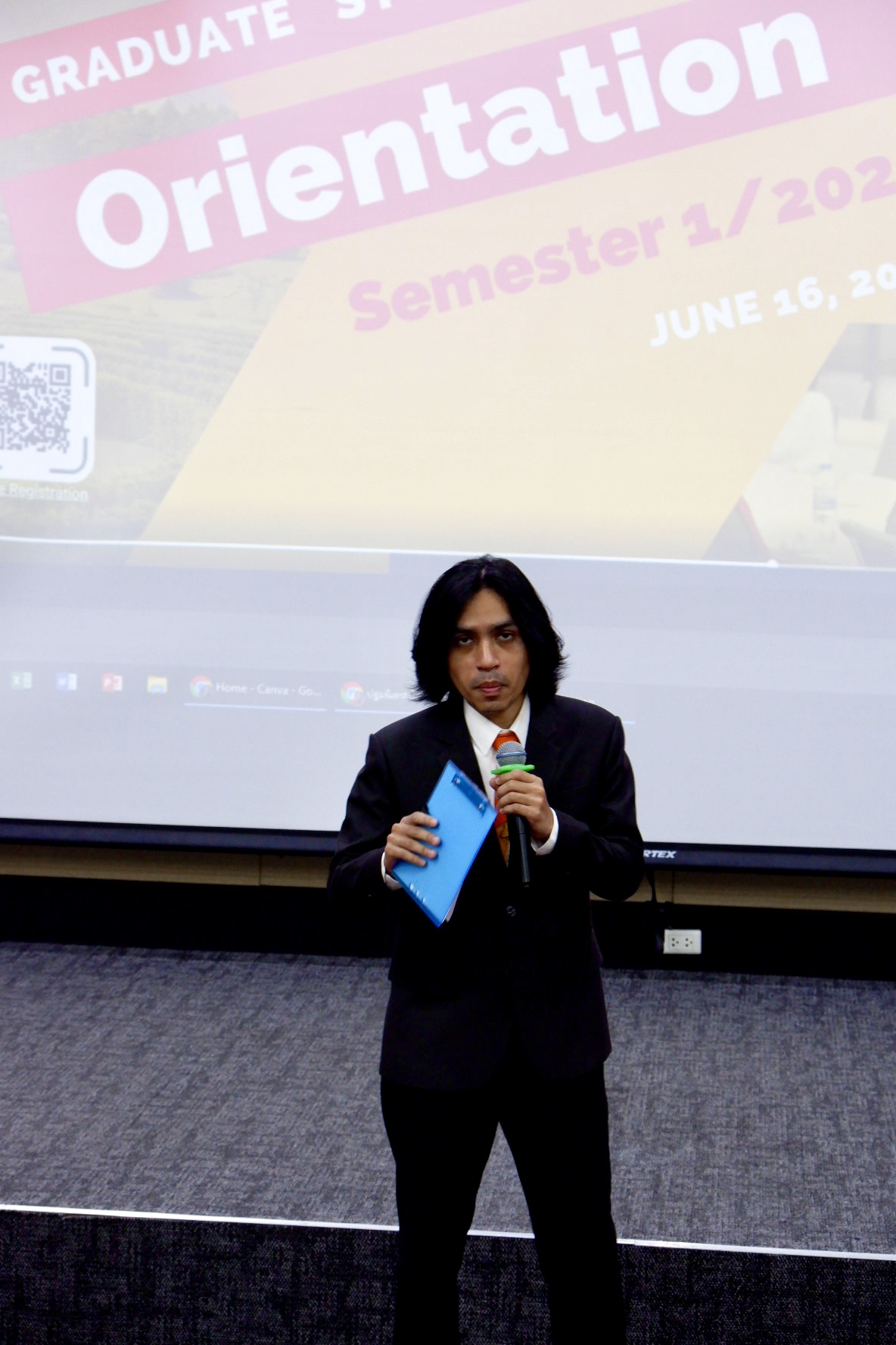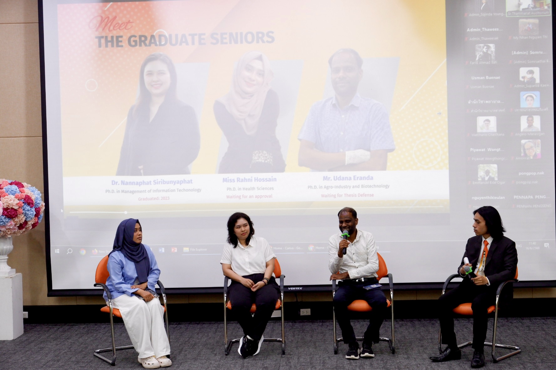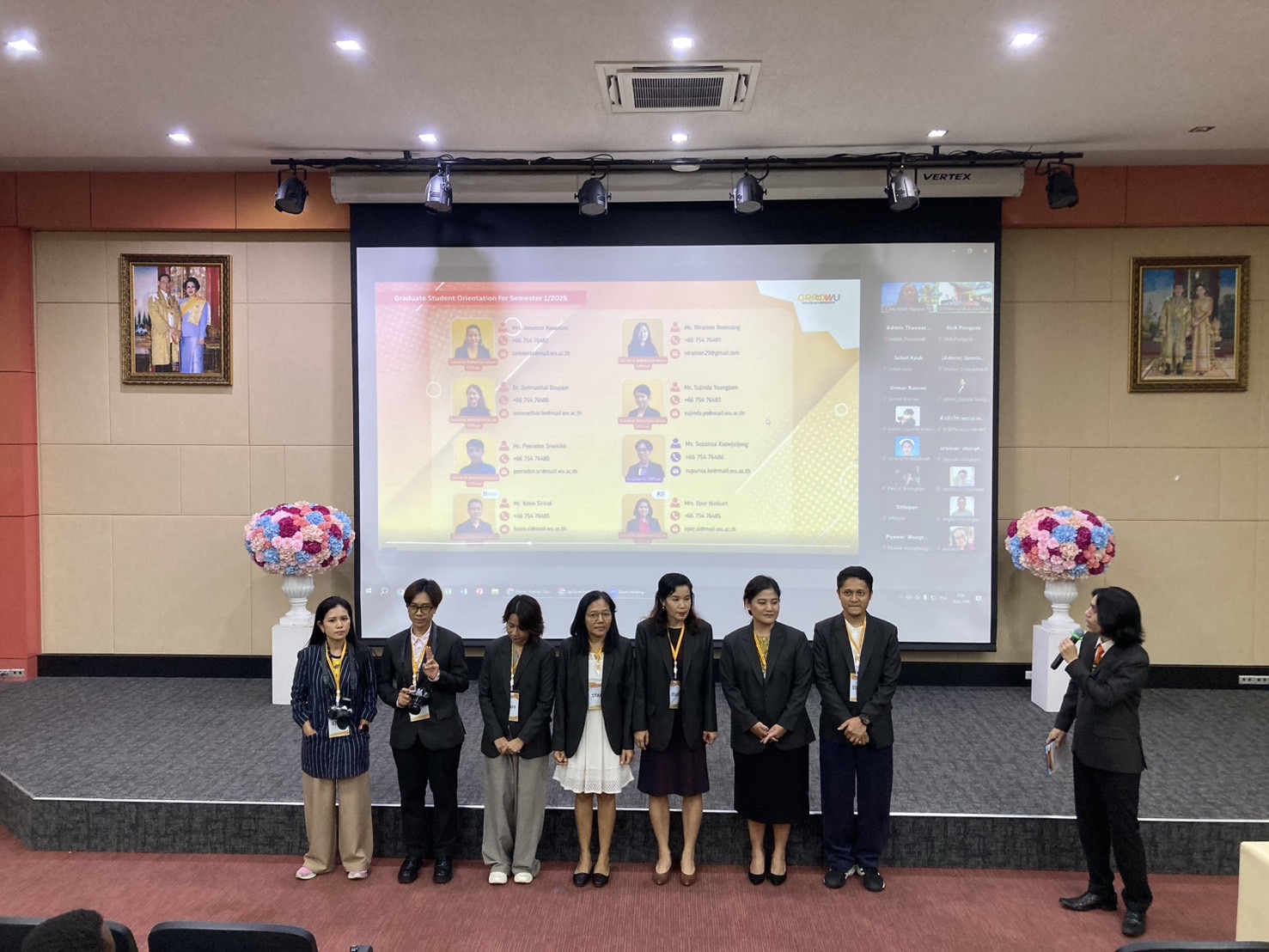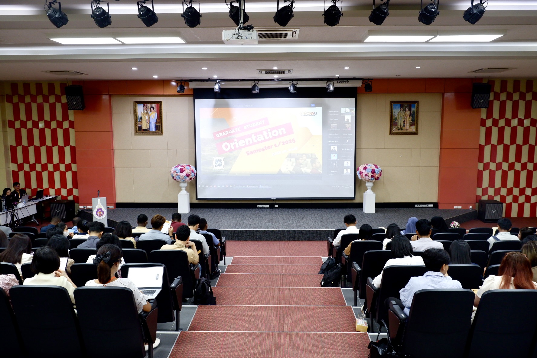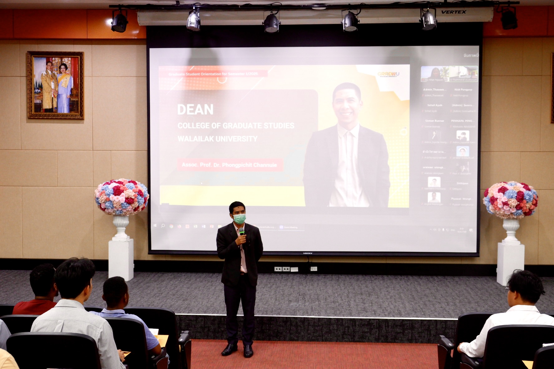 The orientation began with an impressive introductory video showcasing Walailak University, followed by opening remarks from Assoc. Prof. Dr. Mullica Jaroensutasinee, Vice President overseeing the CGS. A warm welcome speech was then delivered by Assoc. Prof. Dr. Phongpichit Channuie, Dean of the CGS at WU.